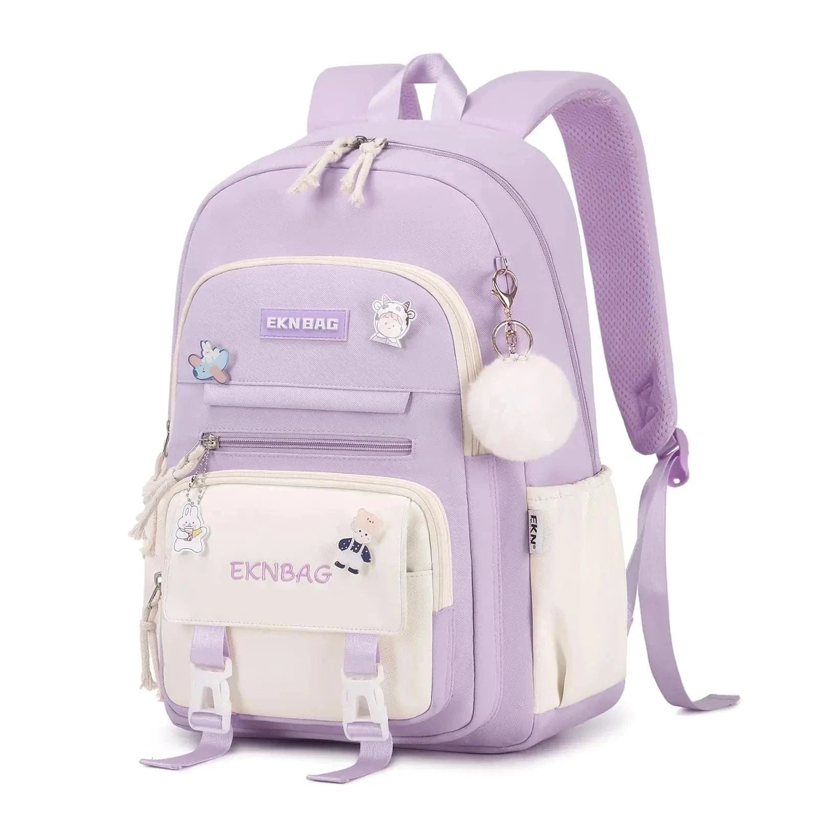 Denna lila skolryggsäck för tjejer kombinerar stil och funktionalitet för en praktisk och trendig look. Ryggsäcken har flera fickor , inklusive en rymlig huvudsektion, en stor frontficka med dragkedja och sidofack för vattenflaska. Justerbara och vadderade axelremmar gör den bekväm att bära hela dagen. Detaljer som gulliga pins, en mjuk pompom och dekorativa remmar ger en lekfull touch. Fremstillet i slitstarkt och lätt material , vilket gör den idealisk för skoldagar, utflykter och vardagsbruk.