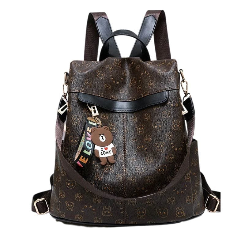 Denne stilfulde rygsæk i kunstlæder med tegneserie-bjørnemotiv er det perfekte valg til den modebevidste kvinde, der ønsker et unikt og legende look. Taskens charmerende design kombinerer praktisk funktion med et sødt, dekorativt udtryk. Den brune farve med printede bjørne og kontrastdetaljer i læderlook giver et varmt og elegant finish. Den har justerbare stropper, rummelig hovedlomme og sikre lynlåslukninger. Perfekt som hverdagstaske, til studie eller shopping, hvor du gerne vil skille dig ud med et feminint, ungdommeligt touch.