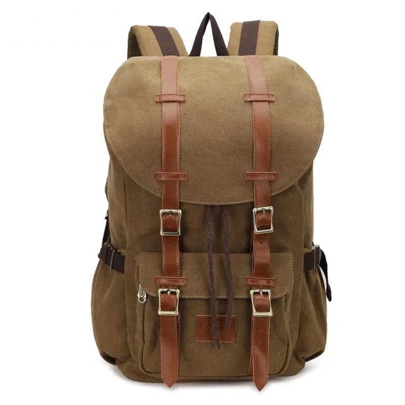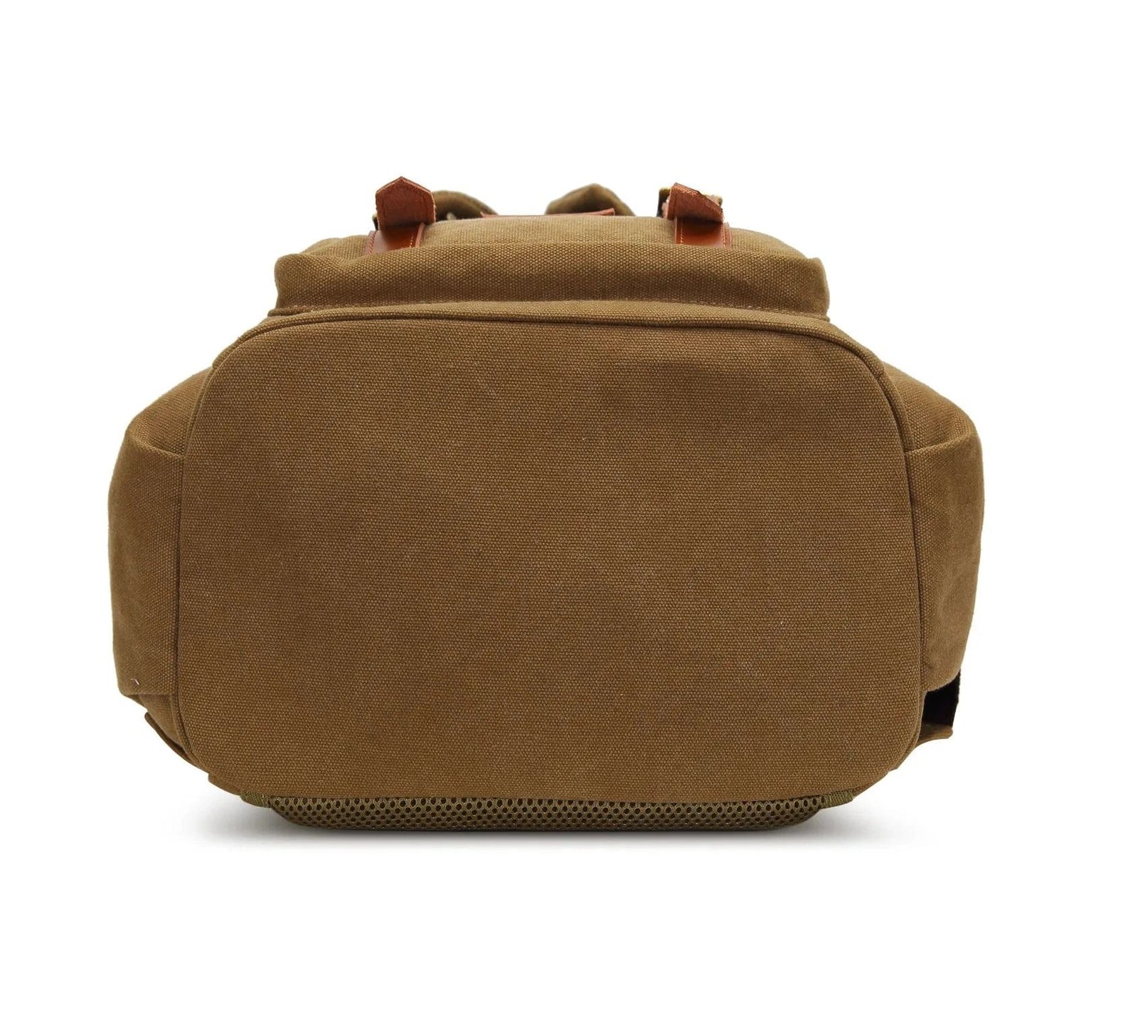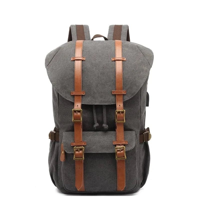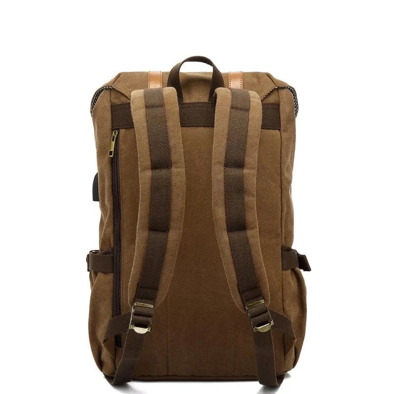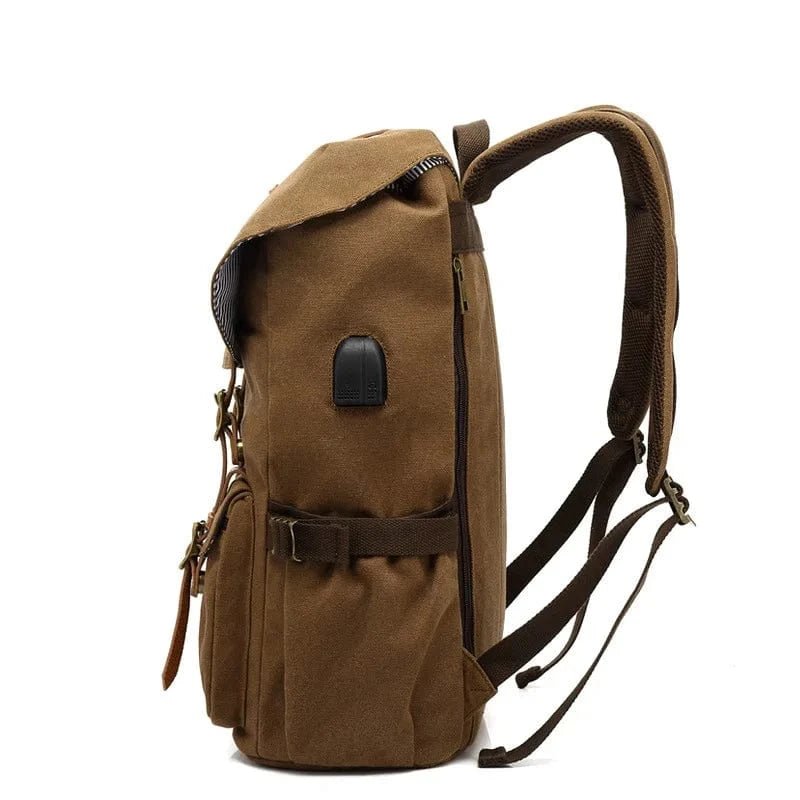 Det rustikke canvas og de messingfarvede spænder giver rygsækken karakter, mens den skjulte USB-port og hovedtelefonudgang gør den ideel til moderne livsstil. En perfekt balance mellem retro og tech.